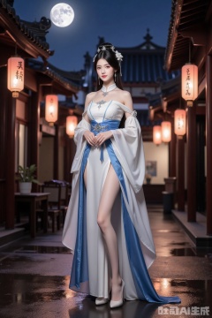 Realistic photo of a young woman with bun, fair skin, big breasts, off-shoulder ancient Hanfu, long legs, high heels, full body, sleeve arrow, night, moon, wet Chinese ancient streets