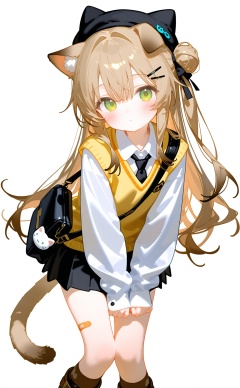 1girl,solo,shirt,skirt,collared shirt,black necktie,black headwear,long hair,green eyes,very long hair,necktie,long sleeves,hair ornament,white shirt,hairclip,sweater vest,black skirt,sleeves past wrists,pleated skirt,hair bun,hair ribbon,closed mouth,looking at viewer,black ribbon,socks,animal hat,ribbon,hair between eyes,hat,single side bun,tail,blush,simple background,brown hair,puffy sleeves,feet out of frame,shoulder bag,white background,puffy long sleeves,kneehighs,standing,animal ears,bag,boots,one side up,beanie,black footwear,cat hat,cat tail,brown socks,charm \(object\),bag charm,single hair bun,bandaid,short sleeves,black socks,light brown hair,brown footwear,bandaid on leg,cat girl,transparent background,knee boots,loose socks,black bow,cat ears,
