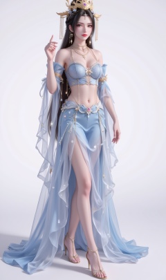 <lora:汉服比基尼·人物百搭款7:1.1>,fuzhuang,1girl,solo,jewelry,dress,skirt,necklace,earrings,bare shoulders,navel,blue dress,hair ornament,white_background,(full body:1.1),high_heels,<lora:李慕婉·衣服百搭款6:1.1>,limuwan,black hair,long hair,grey eyes,jewelry,earrings,crown,phoenix_crown,cover,gradient background,close-up details,outstanding style,adding a touch of dimension to your images without compromising details,close-up,<lora:DJ滤镜_2.5D版:0.3>,lvjing,<lora:油画唯美滤镜15:0.2>,baoshi,