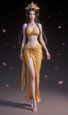 <lora:比基尼1·人物百搭款6:1.1>,bijini,1girl,solo,jewelry,long hair,navel,black hair,barefoot,bracelet,necklace,sarong,breasts,swimsuit,midriff,bandeau,strapless,standing,bikini,bare shoulders,yellow skirt,full body,black_background,simple background,<lora:李慕婉·衣服百搭款6:1.1>,limuwan,black hair,long hair,grey eyes,jewelry,earrings,crown,phoenix_crown,(large breasts:1.2),cover,gradient background,close-up details,outstanding style,adding a touch of dimension to your images without compromising details,close-up,<lora:DJ滤镜_2.5D版:0.3>,lvjing,<lora:油画唯美滤镜15:0.2>,baoshi,