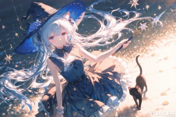 masterpiece,very aware,highres,absurdres,newest,best quality,loli,petite,high quality,chromatic_aberration,cinematic_angle,dutch angle, //,artist:ciloranko,artist:ningen_mame,artist:sho_(sho_lwlw),artist:rhasta,artist:wlop,artist:ke-ta,artist:hiten \(hitenkei\),//,1girl, solo, long hair, looking at viewer, bangs, hat, dress, holding, bare shoulders, jewelry, very long hair, blue hair, white hair, witch hat, blue dress, animal, cat, crescent, wand, witch, black cat, holding wand