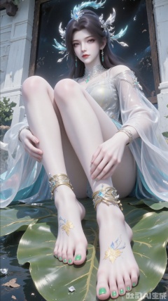 3D rendering of her sitting on a large leaf. Her feet were painted with green nail polish, adding a hint of color to her feet. Her hair was shining and her eyes were red. She wore a white long-sleeved shirt with blue decor on her head, matching green bracelets and a pair of swinging earrings. Her left hand is placed on her left foot and her right hand is placed on her right foot. The background is a white building, and the wall is a black wooden board dotted with water droplets, adding a sense of layering to the picture.