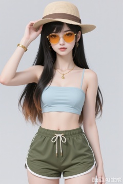 A beautiful anime - style girl with long hair transitioning from black to brown. She's wearing a straw hat with a brown ribbon, orange - tinted sunglasses, a light blue tube top, olive - green drawstring shorts with white trim. Accessorized with a gold bracelet, gold hoop earrings, and a gold pendant necklace. One hand is touching the hat, against a simple light - colored background, high - detail, realistic shading, anime - realistic hybrid style, 8K resolution, photorealistic rendering.