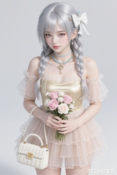 A charming anime - style girl with long silver hair styled in two braids. She adorns her hair with a large white bow and sparkling hairpins. Her outfit is a gold - toned off - the - shoulder, tiered tulle dress. She's accessorized with a key - shaped pendant necklace, a delicate choker with blue stones, and matching earrings. She holds a bouquet of pink and white roses in one hand and carries a white wicker handbag with a gold emblem on the other. Against a simple light - gray background, high - detail, realistic shading, anime - realistic hybrid style, 8K resolution, photorealistic rendering.