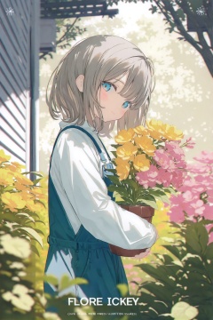 loli,1girl,solo,looking at viewer,flower,plant,outdoors,holding,white shirt,shirt,long sleeves,grey hair,tree,overalls,flower pot,potted plant,pink flower,yellow flower,day,blurry,from side,english text,building,short hair,looking to the side,copyright name,copyright notice,bush,closed mouth,medium hair,garden,blue eyes,blush,blue overalls,leaf,(masterpiece,best quality,highres,absurdres,best quality,amazing quality,very aesthetic,absurdres),