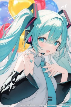 loli,1girl,hatsune miku,solo,long hair,balloon,necktie,twintails,detached sleeves,aqua nails,aqua hair,open mouth,headset,very long hair,shirt,aqua eyes,black sleeves,aqua necktie,smile,copyright notice,heart balloon,nail polish,looking at viewer,signature,upper body,hair between eyes,collared shirt,sleeveless,sleeveless shirt,hand on own chest,hair ornament,long sleeves,watermark,tie clip,white shirt,blue necktie,bare shoulders,anniversary,blush,grey shirt,:d,grey background,microphone,(masterpiece,best quality,highres,absurdres,best quality,amazing quality,very aesthetic,absurdres),