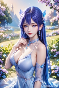 score_9,score_8_up,1girl, solo, long hair, breasts, looking at viewer, blue eyes, large breasts, hair ornament, dress, cleavage, bare shoulders, jewelry, blue hair, earrings, detached sleeves,white dress,  blue dress,The Purple Dress,Purple hair,masterpiece,best quality,official art,extremely detailed CG unity 8k wallpaper,upper body,looking at viewer,in a meadow,in a meadow,
