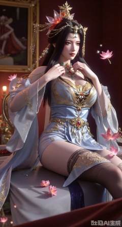 (masterpiece:1.2),best quality,A high - resolution digital artwork of a regal young woman in an elaborate fantasy - inspired hanfu. She has long, flowing dark hair, adorned with an ornate headdress encrusted with jewels and fine, sheer veils. Her face is exquisitely detailed, with large, expressive eyes, a straight nose, and full lips painted in a vibrant red. She wears a light blue and silver gown with intricate golden embroidery that depicts flowing patterns, giving it an ethereal look. The dress features a deep V - neckline, decorated with multiple layers of necklaces with gemstone pendants. Her sleeves are semi - transparent and flowy, adding to the graceful aura. A wide blue sash with a large bow cinches her waist, embellished with a star - shaped ornament and more golden detailing. In her hand, she holds a pink lotus flower, and around her, small pink lotus blossoms and sparkling stars float in the air. The background is a dark, luxurious setting with golden, ornate frames, suggesting a palace or imperial hall, illuminated by soft, ambient light that highlights the details of her attire and the magical elements around her.She sat on the marble countertop, barefoot, tidying up the collar of her white shirt, and her clothes slid smoothly at her fingertips. The black leggings fit her legs well, the purple stockings were filled with a soft luster, and the warm and diffuse light in the room added to its authenticity. The picture is divided into three equal parts: one third of the lower is the tabletop, the middle is her upper body, and a wall illuminated by soft light on it. Every needle and thread of the shirt, every subtle fold on the black leggings, is carefully depicted, and everything is shrouded in warm beige and soft apricots, evoking the eternal elegance of the classic movie scene..(huge breasts:2.99),(full breasts:2.99),XyunwangshuY,Xyanqingfei,Xbigbreasts,XyinyueX,Xnvwashenian,XyunwangshuHF,Xxiuhefu