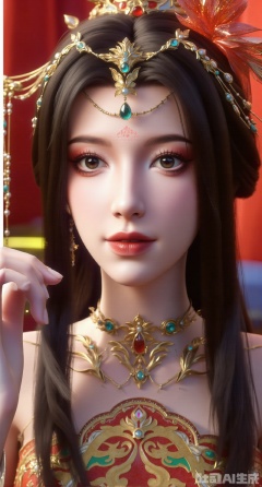 (masterpiece:1.2),best quality,a close-up shot of a Chinese woman's head is adorned with a gold crown adorned with red and blue stones. Her eyes are a piercing blue, her hair is a dark brown, and she's wearing a red and green dress adorned with gold embroidery and a red choker around her neck. Her dress is adorned in a vibrant red, green and gold pattern, and her hair cascades down to her shoulders. She is wearing a pair of gold earrings, adding a touch of contrast to her outfit. The backdrop is blurred, with a red curtain and a white railing visible in the background..(huge breasts:2.99),(full breasts:2.99),XyunwangshuY,Xyanqingfei,Xbigbreasts,XyinyueX,Xnvwashenian,XyunwangshuHF,Xxiuhefu