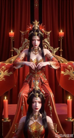 (masterpiece:1.2),best quality,In a dimly lit, red-painted chamber with intricately patterned curtains, a stunning lady sits on a majestic red bed adorned with phoenix-inspired tapestries and tassels. She wears a lavish hanfu dress with long sleeves, its golden trimmings catching the soft candlelight from two ornate red candles. Her raven-black hair is styled with a delicate hair stick and topped with a majestic phoenix crown. A subtle blush adorns her cheeks as she gazes downward, her red lips subtly parted. The room's atmosphere is one of mystique, with ancient Chinese architecture visible through the curtains. The lady's eyes are framed by striking black eyeliner, while her soft breasts, barely contained within the low-cut dress, hint at a sense of vulnerability and shyness. Amidst this fantasy setting, two red candles stand sentinel, their flames casting a warm, golden glow on the subject's porcelain complexion.(huge breasts:2.99),(full breasts:2.99),XyunwangshuY,Xyanqingfei,Xbigbreasts,XyinyueX,Xnvwashenian,XyunwangshuHF,Xxiuhefu