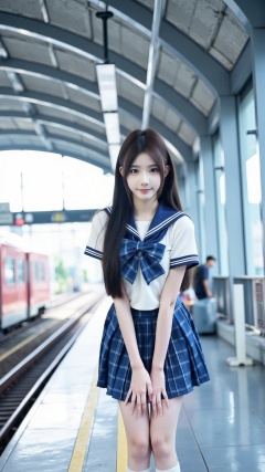 The photograph captures a young Asian woman standing in a modern,indoor train station. She has long,straight black hair with bangs,and her skin is fair. She is wearing a traditional Japanese schoolgirl uniform consisting of a white short-sleeved blouse with a large blue plaid bow at the collar,and a matching blue plaid skirt that reaches mid-thigh. She also wears knee-high white socks and black shoes. The woman is leaning forward slightly,with her hands resting on her knees,and she is smiling gently at the camera.,The background features a sleek,modern train station with a high,ribbed ceiling and large windows that allow natural light to fill the space. The floor is shiny and reflective,with a yellow safety line running along the edge. To the left,there is a red and white train visible through the windows,indicating the station is in use. The overall color palette of the image includes cool blues and grays from the station,contrasting with the bright white of her blouse and the blue of her skirt and bow. The photograph is sharp,with a focus on the woman,and the lighting is even,highlighting her and the details of her outfit.,