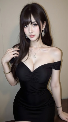 1girl,loli,A solo singer,with a voluptuous figure,wearing a black dress with a off-the-shoulder design,showcasing a décolletage,and adorned with jewelry including earrings. She has long black hair,rouged lips,smooth skin with a blushed complexion,and a charming smile. Photorealistic depiction with meticulous details,capturing a vivid and lifelike image. Loli-style features add a unique charm to the character.,