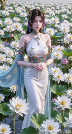 Barefoot,The best quality, ultra-high resolution, masterpiece, original, extremely fine wallpaper, perfect light effect, this is a digital illustration, vertical full-body portrait, densely packed with white flowers, creating a rich and textured background. In the center of the picture, a beautiful Chinese woman is in the white flowers, making her look like she is part of a garden full of flowers. The flowers around her add depth and sense of encirclement to the picture and enhance the layering of the composition. Her stunning white evening gown echoes the purity and elegance of the surrounding flowers. The woman was facing the camera, among the lush flowers, her eyes were charming and quiet. The dense floral background and capture of the woman's whole body highlight the exquisite fusion of human elegance and nature. The long black green hair is straight, the picture has blur and halo effects, and butterflies embellish it. She has an angel's beautiful face and a perfect female figure (a skirt composed of flowers, intensity coefficient, translucent body, transparent petals, glowing petals, gradient effect, contour light, particles, award-winning artwork. She has fair skin tone, fine black details and soft and flowing hair carefully combed to complex hair accessories, with gorgeous details. She is in a bright garden with gorgeous flowers, a blue sky, and deep and rich tones.), her head is decorated with exquisite and complex hair accessories, and some tulle fabrics naturally hang down, creating a dreamy feeling, exquisite and unique. The overall look shows the beauty and tenderness of a girl, just like a fairy in a fairy tale, exuding charm. This charming character is portrayed in a surreal style. She has elegant movements, and the overall style of this illustration is extremely delicate, focusing on the combination of realistic and fantasy elements.(Suzhou Garden Lotus Pond,pink lotus,green Lotus Leaf:1.39),(huge breasts:2.99), (full breasts:2.99),,XyunwangshuY,Xyanqingfei,Xbigbreasts,Xyingluo,XyunwangshuHF