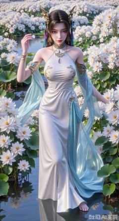 Barefoot,The best quality, ultra-high resolution, masterpiece, original, extremely fine wallpaper, perfect light effect, this is a digital illustration, vertical full-body portrait, densely packed with white flowers, creating a rich and textured background. In the center of the picture, a beautiful Chinese woman is in the white flowers, making her look like she is part of a garden full of flowers. The flowers around her add depth and sense of encirclement to the picture and enhance the layering of the composition. Her stunning white evening gown echoes the purity and elegance of the surrounding flowers. The woman was facing the camera, among the lush flowers, her eyes were charming and quiet. The dense floral background and capture of the woman's whole body highlight the exquisite fusion of human elegance and nature. The long black green hair is straight, the picture has blur and halo effects, and butterflies embellish it. She has an angel's beautiful face and a perfect female figure (a skirt composed of flowers, intensity coefficient, translucent body, transparent petals, glowing petals, gradient effect, contour light, particles, award-winning artwork. She has fair skin tone, fine black details and soft and flowing hair carefully combed to complex hair accessories, with gorgeous details. She is in a bright garden with gorgeous flowers, a blue sky, and deep and rich tones.), her head is decorated with exquisite and complex hair accessories, and some tulle fabrics naturally hang down, creating a dreamy feeling, exquisite and unique. The overall look shows the beauty and tenderness of a girl, just like a fairy in a fairy tale, exuding charm. This charming character is portrayed in a surreal style. She has elegant movements, and the overall style of this illustration is extremely delicate, focusing on the combination of realistic and fantasy elements.(Suzhou Garden Lotus Pond,pink lotus,green Lotus Leaf:1.39),(huge breasts:2.99), (full breasts:2.99),,XyunwangshuY,Xyanqingfei,Xbigbreasts,Xyingluo,XyunwangshuHF