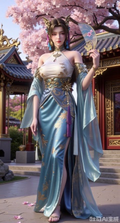 (masterpiece, best quality:1.23)A long - legged ancient - style courtesan girl, wearing a gorgeous and lightweight brocade ruqun. The hem of the skirt is embroidered with delicate peony patterns, with bright colors. She wears a semi - transparent gauze cape, fluttering in the wind. Her hair is combed into a complex bun, adorned with gold hairpins and pearl - jade headdresses, red ruby earrings on her ears, and a jade necklace around her neck. Holding a folding fan painted with orchids, standing in front of an antique pavilion, with a blooming peach tree behind her, showing a charming and amorous style,(huge breasts, full breasts:2.98),XyunwangshuY,Xyanqingfei,Xbigbreasts,Xyingluo,XyunwangshuHF,XyinyueX