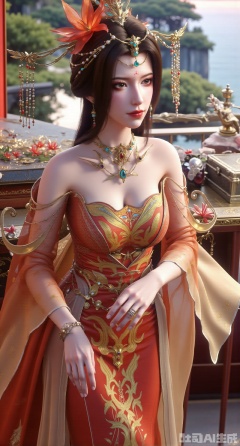 (masterpiece, best quality:1.23)A maiden waiting to get married, wearing a Chinese - style wedding dress with a phoenix coronet and xiapei, is sitting dignifiedly in front of the dressing table by the window of her boudoir. The xiapei is orange - red, embroidered with patterns of lilies and butterflies meaning a harmonious union for a hundred years. The wings of the butterflies are dotted with small sequins, twinkling in the light. The phoenix coronet has a silver base, inlaid with a large number of pearls and sapphires, with a solemn and luxurious shape. The maiden is fixing her bun with a hairpin. Several fresh flowers are inserted into her bun, adding a bit more charm. On the dressing table are a silver powder box, a round fan with an ivory handle, and some hair accessories. The scenery outside the window is like a painting, with green mountains and clear waters in sight, adding a peaceful beauty to this scene of waiting to get married,(huge breasts, full breasts:2.98),XliumeiY,XyueliuY,Xyunwangshu,XlishaoyinY,XyunwangshuxiheY,XlinziyueYH,XtangzichenK,Xnuwashenian,Xbigbreasts,XyanqingfeiY,XyinyueXH,XyunwangshuBF,XyunwangshuHF