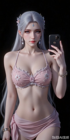 bijini,1girl,solo,jewelry,long hair,swimsuit,sarong,breasts,bikini,bracelet,selfie,navel,phone,collarbone,flower,black hair,floral print,brown hair,cellphone,cleavage,skirt,cowboy shot,earrings,holding,black_background,simple background,