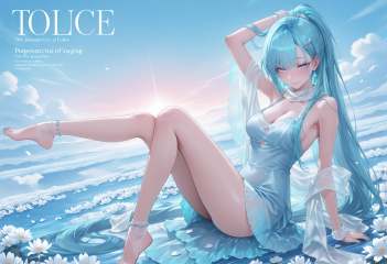 portrait,Cirrocumulus,Cirrostratus,sky,wind,petals,white flowers,magazine cover,backlighting,text,masterpiece,best quality,amazing quality,very awa,newest,very aesthetic,<lora:L.L:1>,L.L,absurdly long hair,aqua hair,blue and pink eyes,blue hair,hair behind ear,ponytail,anklet,aqua nails,bare shoulders,cleavage,earrings,hair ornament,hairclip,jewelry,see-through,scarf,shawl,toeless legwear,toenail polish,white and blue dress,looking_at_viewer,seductive_smile,dynamic_angle,armpits,stretch,detailed eyes,detailed hands,detailed feet,detailed face,