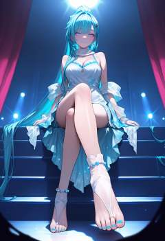 masterpiece,best quality,ultra-detailed,very aesthetic,sharp focus,vibrant colors,ray tracing,best lighting,detailed illustration,detailed background,light,vibrant colors,glow,looking_down,from_below,sit on the edge of the stage,stage,concert,sound,voicevox,red curtain,soft shadows,soft natural lighting,dramatic lighting,rich tones,low angle,gradient,looking_at_viewer,smile,(darkness:1.5),(foot focus:1.1),front view,crossed_legs,absurdly long hair,aqua hair,blue and pink eyes,blue hair,hair behind ear,ponytail,<lora:L.L:1>,anklet,aqua nails,bare shoulders,cleavage,earrings,hair ornament,hairclip,jewelry,see-through,scarf,shawl,toeless legwear,toenail polish,white and blue dress,