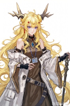 looking at viewer,leizi\(arknights\),pointy_ears,hair_between_eyes,blonde_hair,messy_hair,breasts,bangs,purple eyes,very long hair,dragon horns,antlers,dragon tail