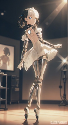 bangbi,1girl, solo, looking at viewer, blue eyes,blunt bangs, black hair, gloves, dress, full body, braid, white hair, multicolored hair, gradient, gradient background, science fiction, android, joints, robot joints,, indoors, white gloves, white dress, only,White ballet skirt, white silk, ballet, On the stage, a person dances, stage lights, dazzling dance postures,dance practice,sunset light, elegant, charming,  see-through,see-throughs silhouettes,intoxicated,tiptoe,