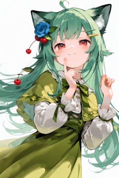 masterpiece,very aware,highres,absurdres,newest,best quality,loli,petite,high quality,chromatic_aberration,cinematic_angle,dutch angle, //,1girl, solo, long hair, looking at viewer, blush, smile, bangs, hair ornament, red eyes, white background, dress, bow, ribbon, animal ears, twintails, closed mouth, hair ribbon, flower, frills, food, green hair, hairclip, hands up, capelet, fruit, rose, index finger raised, hand on own face, green bow, blue flower, green dress, hand on own cheek, food-themed hair ornament, blue rose, cherry, green capelet, cherry hair ornament<lora:lp45up1-000009:0.8>