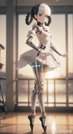 bangbi,1girl, solo, looking at viewer, blue eyes,blunt bangs, black hair, gloves, dress, full body, braid, white hair, multicolored hair, gradient, gradient background, science fiction, android, joints, robot joints,, indoors, ballet, On the stage, a person dances, stage lights, dazzling dance postures,dance practice,sunset light, elegant, charming,  see-throughs silhouettes,intoxicated,tiptoe,