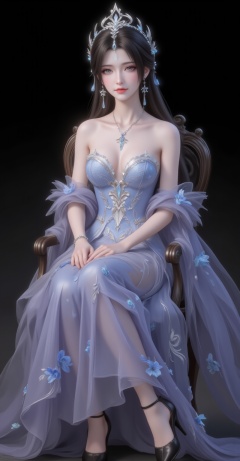 <lora:晚礼服1·人物百搭款6:1>,fuzhuang,1girl,dress,solo,bare shoulders,skirt hold,blue dress,black hair,long hair,breasts,strapless,strapless dress,flower,long dress,full body,high_heels,sitting,chair,legs,crossed_legs,black_background,simple background,cover,gradient background,close-up details,outstanding style,adding a touch of dimension to your images without compromising details,close-up,<lora:DJ滤镜_2.5D版:0.3>,lvjing,<lora:油画唯美滤镜15:0.2>,baoshi,<lora:清漪·衣服百搭款·6:1.1>,qingyi,black hair,long hair,jewelry,earrings,hair_ornament,grey eyes,crown,(large breasts:1.2),