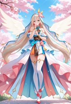 1girl,solo,cherry blossoms,shirt,holding,petals,flower,looking at viewer,upper body,branch,pink flower,white shirt,bare shoulders,collared shirt,sleeveless shirt,holding flower,outdoors,falling petals,day,sky,blue sky,leaf,eyelashes,light particles,dappled sunlight,sunlight,pink theme,tree,covering mouth,hand up,covered mouth,<lora:祈忆歌:1>,qiyige,1girl,long hair,beige hair,blonde hair,hair ornament,green eyes,flower,ahoge,white hair,multicolored hair,wings,streaked hair,veil,thighhighs,jewelry,very long hair,flower,high heels,white thighhighs,low-tied long hair,absurdly long hair,full body,intricate details,anime costume,elegant outfit,flowing dress,layered clothing,asymmetric hem,bell sleeves,ruffled skirt,obi waistband,off-shoulde,silk satin fabric,translucent tulle accents,gold embroidery,white base clothing,pink-orange gradient accents,lowres,blue floral motifs,red petal details,floating ribbons,airborne clothing,dynamic wind effect,sparkling particles,