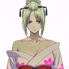 looking at viewer,Tsukuyo,Gintama_anime_style,blonde_hair,purple eyes,scar,parted bangs,scar on forehead,scar on face,folded ponytail,scar on cheek,japanese clothes,print kimono