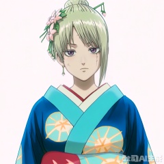 looking at viewer,Tsukuyo,Gintama_anime_style,blonde_hair,purple eyes,scar,scar on forehead,scar on face,folded ponytail,scar on cheek,hair bun,bangs,blue_kimono
