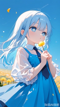 ((artist:nano)),loli,1girl,blue theme,Tie dyeing,A girl holding a dandelion flower, wearing a blue dress with white dots and yellow flowers on it, blowing away small petals in the style of light skyblue and pale aquamarine illustrations, a simple line drawing reminiscent of children's book illustrations and storybook art, with colorful cartooning and playful character design