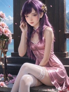 score_9,score_8_up,score_7_up,realistic,photorealistic,1girl,looking_at_viewer,realistic,dynamic poses,1girl,Vivid Colors,bright environment,delicate water,hair_ornament,shiny skin,shiny hair,reflection,dress,flower sea,falling petals,extreme detail description,(upper body:0.3),put one hand on your side,(skindentation:1.3),bright,sunshine on face,light,sweating,dress,light,sitting_down,long hair,(skinny:1.3),lower leg,thin legs,slim hips,very slender legs,pink dress,white thighhighs,