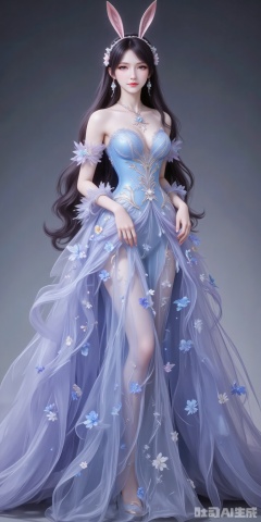 fuzhuang,1girl,dress,solo,bare shoulders,skirt hold,blue dress,black hair,long hair,breasts,strapless,strapless dress,flower,long dress,full body,high_heels,cover,gradient background,close-up details,outstanding style,adding a touch of dimension to your images without compromising details,close-up,