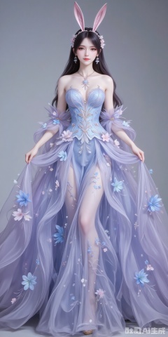 fuzhuang,1girl,dress,solo,bare shoulders,skirt hold,blue dress,black hair,long hair,breasts,strapless,strapless dress,flower,long dress,full body,high_heels,cover,gradient background,close-up details,outstanding style,adding a touch of dimension to your images without compromising details,close-up,