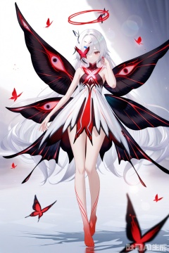 khaos lv.1,1girl, long hair, hair ornament, red eyes, dress, bare shoulders, very long hair, white hair, heart, wings, barefoot,red feet, white dress, tattoo, halo, bug, butterfly, butterfly wings,butterfly over one eye,depth of field, light particles, lens flare, masterpiece,best quality,((artist:reoen),(artist:fuzichoco),(artist:atdan),(artist:torino_aqua:0.5),year 2024:0.5),(artist:omone_hokoma_agm:0.8), 2d, anime,full body,floating,