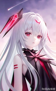 khaos,1girl, looking at viewer,long hair, bangs, red eyes, dress,black dress, bare shoulders, white hair, headgear, pale skin, upper body, cloudy sky,shooting star,