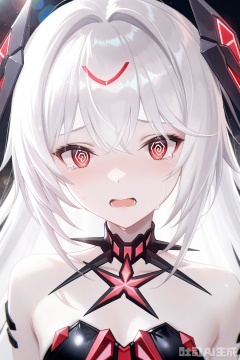 khaos,1girl, looking at viewer,long hair, bangs, red eyes, dress,black dress, bare shoulders, white hair, headgear, pale skin,hair ornament,looking at viewer,tears,portrait, @ @, open mouth,,depth of field, light particles, lens flare, masterpiece,best quality,((artist:reoen),(artist:fuzichoco),(artist:atdan),(artist:torino_aqua:0.5),year 2024:0.5),(artist:omone_hokoma_agm:0.8), 2d, anime,