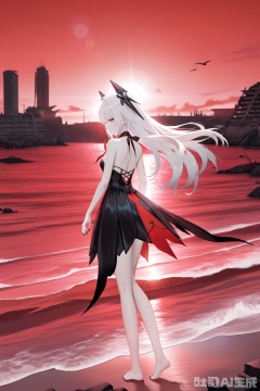 khaos,1girl,solo, looking at viewer,long hair, bangs, red eyes, dress,black dress, bare shoulders, white hair, headgear, pale skin,nail polish,depth of field, light particles, lens flare, masterpiece,best quality,((artist:reoen),(artist:fuzichoco),(artist:atdan),(artist:torino_aqua:0.5),year 2024:0.5),(artist:omone_hokoma_agm:0.8), 2d, anime,scenery, watercraft, outdoors,ravens, ocean, building,red sky, water,red and black theme,standing,from behind,looking at viewer,perfect hands,barefoot,seaside,red sea,red waves,detailed water,good_hands,ruins,from side,