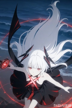 khaos,1girl,solo,loli,looking at viewer,long hair, bangs, red eyes,bare shoulders, white hair, headgear, pale skin, black dress, floating hair, anime aesthetic,sea,windy,floating hair,,floating dress,from above,looking up,