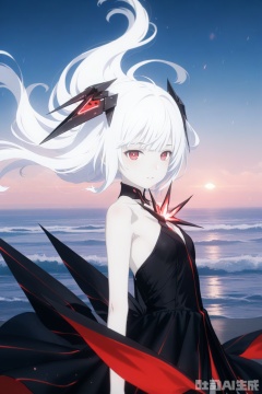 khaos,1girl,solo,loli,looking at viewer,long hair, bangs, red eyes,bare shoulders, white hair, headgear, pale skin, black dress, floating hair, anime aesthetic,sea,windy,floating hair,,floating dress,from side,