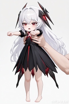 khaos,1girl,dress,black dress,long hair, bangs, red eyes,white hair,barefoot,headgear,(artist:prab:1.08),artist:abpart,(artist:modare:0.8),female focus,best quality,newest,best quality,amazing quality, very aesthetic, absurdres,masterpiece,best quality,newest,IncrsXLLCM,full body, chibi, holding person,open mouth,Stagnation expression