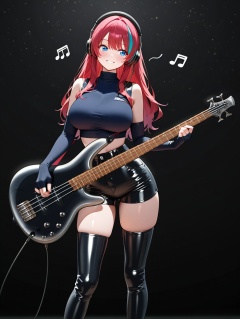 (1woman playing bass guitar),lighting strom,big breasts,smile,beautiful eyes,cool tone long hair,streaked long hair,she wear a emon \(glossy black\),sleeveless,high-neck crop top made of shiny,stretchy material that hugs her torso and highlights her slim waist. The top has a slight sheen,making it look like leather or vinyl. She's paired it with high-waisted black leather shorts that have a shiny finish and zippers on the sides,showing off her fit legs,elbow fingerless gloves,lovestruck,headphone,highheel thigh boots,musical notes,starry sky,textures,detailed texture,very detailed face,masterpiece,best quality,good quality,very awa,very aesthetic,absurdres,newest,<lora:SR300E X20A10:1>,