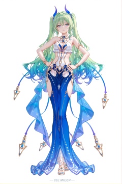 8k,best quality,masterpiece,(ultra-detailed),(high detailed skin),((artist:reoen),(artist:fuzichoco),(artist:atdan),(artist:torino_aqua),year 2024:0.8)1girl,[artist:wlop],[artist:ningen_mame],artist:ciloranko,[[artist:rhasta]],artist:tidsean,colorful,jijia,2d,ambient light,full body,full shot,standing,looking at viewer,(solo:1.2),simple background,(white background:1.2),hand on own hip,(white background:1.1),<lora:mobius-ill-Tanger:0.8>,mobius, mobius's swimsuit, 1girl, breasts, long hair, green hair, multicolored hair, blue dress, twintails, blue horn hair ornaments,