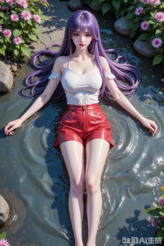 Masterpiece, top quality, high quality, (colorful), small chest, (purple hair: 1.4), Realistic photos, 1girl, long hair, fair skin, big breasts, off-shoulder shirt, short pencil skirt, (wet pantyhose), long legs, red high heels, full body, lying in water, garden, flowers, (heavy rain), wet through, flowing water, top view,