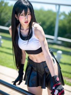 1girl, tifa lockhart, solo, skirt, thighhighs, long hair, gloves, earrings, black hair, suspenders, jewelry, crop top, black thighhighs, **** top, red eyes, black skirt, suspender skirt, elbow gloves, white **** top, looking at viewer, fingerless gloves, midriff, black sports bra, leaning forward, blurry, black gloves, large breasts, lips, arm guards, blurry background, railing, black undershirt, undershirt, collarbone, low-tied long hair, miniskirt, elbow pads