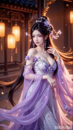 The main subject of the image is a woman in classical, flowing attire—her long black hair styled into an elaborate high bun, adorned with purple silk flowers, blue leaves, and small white blossoms, with slightly curled ends falling over her shoulders. Her face has exquisite makeup: purple pupils, long lashes, light pink lips, and fair, radiant skin. She wears a light purple off-shoulder long dress, the top part made of transparent tulle with silver floral embroidery on the shoulders and cuffs, the skirt composed of multiple layers of lightweight purple tulle scattered with tiny sequins—when she moves, the skirt flutters in the wind, creating a lively, dynamic effect. The woman stands sideways, right hand gently touching her shoulder, left hand naturally extending to lift the skirt, exuding an elegant posture. The background is a nighttime Chinese scene: blurred wooden structures and hanging warm yellow lanterns create a soft halo, light shining from the side gilds her hair and skirt with a golden edge. The overall atmosphere is dreamy and warm, blending classical charm with romantic aura.