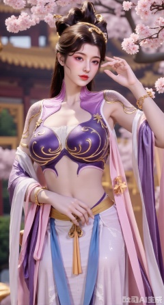 (masterpiece, best quality:1.2),1girl, solo, long hair, breasts, looking at viewer, large breasts, hair ornament, dress, bare shoulders, jewelry, purple eyes, long hair, flower, earrings, outdoors, parted lips, necklace, hand on hip, petals, hanfu dress, cherry blossoms, long dress, architecture, east asian architecture, falling petals,(gigantic breasts:2.99),(full breasts:2.99),,Xhanfududou,Xsongzhihanfu,Xlujiajia,Xyanqingfei,XfuqingyunY,Xtangqixiongshanqun