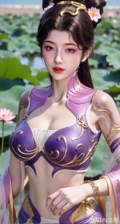(masterpiece, best quality:1.2),1girl, navel, solo, midriff, bare shoulders, hair ornament, flower, hair flower, black hair, red lips,BREAK, (looking at viewer:1.39), chinese clothes,(Holographic long dress:1.39), (lace,Rainbow Gradient Color:1.29),BREAK,purple eyes,blurry, solo focus, long hair, lips, daytime, lipstick, outdoors, (upper body,,Long legs:1.29), blurry,(huge breasts,full breasts:2.41), background, 1girl, makeup, hair bun,(Blue sky:1.39),(Suzhou Garden Lotus Pond,lotus,Lotus Leaf:1.39),(huge breasts:2.99),(full breasts:2.99),(Background with traditional Chinese architecture, lotus pond and lotus flowers:1.39),,,Xhanfududou,Xsongzhihanfu,Xlujiajia,Xyanqingfei,XfuqingyunY,Xtangqixiongshanqun