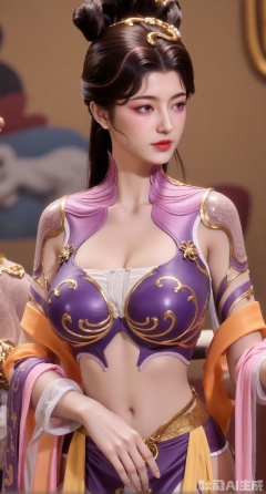 (masterpiece, best quality:1.23),A Hanfu - dressed girl presenting the style of a Dunhuang flying - apsara dancing maiden. She wears a light - purple chest - high ruqun embroidered with complex flame patterns in gold thread, with a strong visual impact. The upper ru has a narrow - sleeve design, and the cuffs are embroidered with white cloud patterns. The girl's hair is combed into a falling - horse bun, with a gold hairpin with pendants inlaid with pearls inserted in her hair, swaying gently with her movements. She drapes an orange - red pibo shawl over her shoulders, flying as if dancing in the clouds. The background is the mural scene of the Dunhuang Mogao Grottoes, with the images of bodhisattvas and celestial musicians faintly visible, and part of it is blurred,(huge breasts, full breasts:2.98),Xhanfududou,Xsongzhihanfu,Xlujiajia,Xyanqingfei,XfuqingyunY,Xtangqixiongshanqun,Xfeitianhanfu